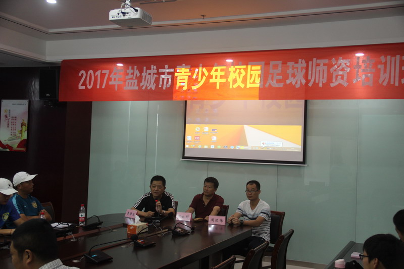 9月11日-14日,盐城市体育场举办2017年盐城市青少年校园足球师资培训班,邀请北京体育大学原足球教研室副主任陈效科教授来盐,对我市2017年新评定的48所校园足球特色学校的骨干教师,进行了校园足球基础理论与足球运动基本技能、校园足球队组建与训练、足球技战术教学与体能训练等方面的专业培训。