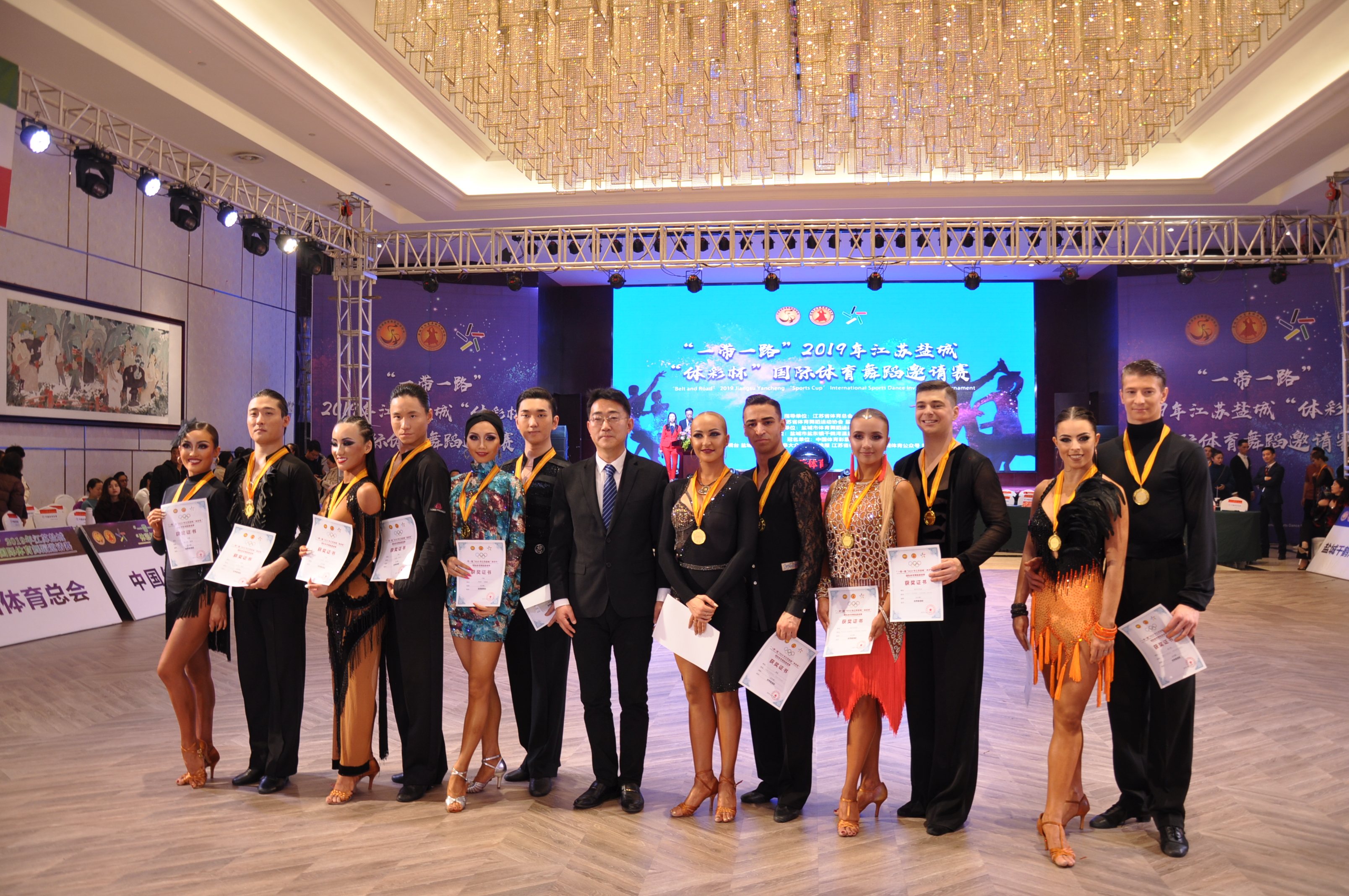 12月2日,“一带一路”2019年江苏盐城“体彩杯”国际体育舞蹈邀请赛在盐城市千鹤湾温泉风情小镇举行,来自中国及俄罗斯、德国、意大利等6个国家的体育舞蹈优秀选手同场竞技,用高雅优美的舞姿,充满激情的节拍,动人的肢体语言,传递着友谊、合作和共赢。