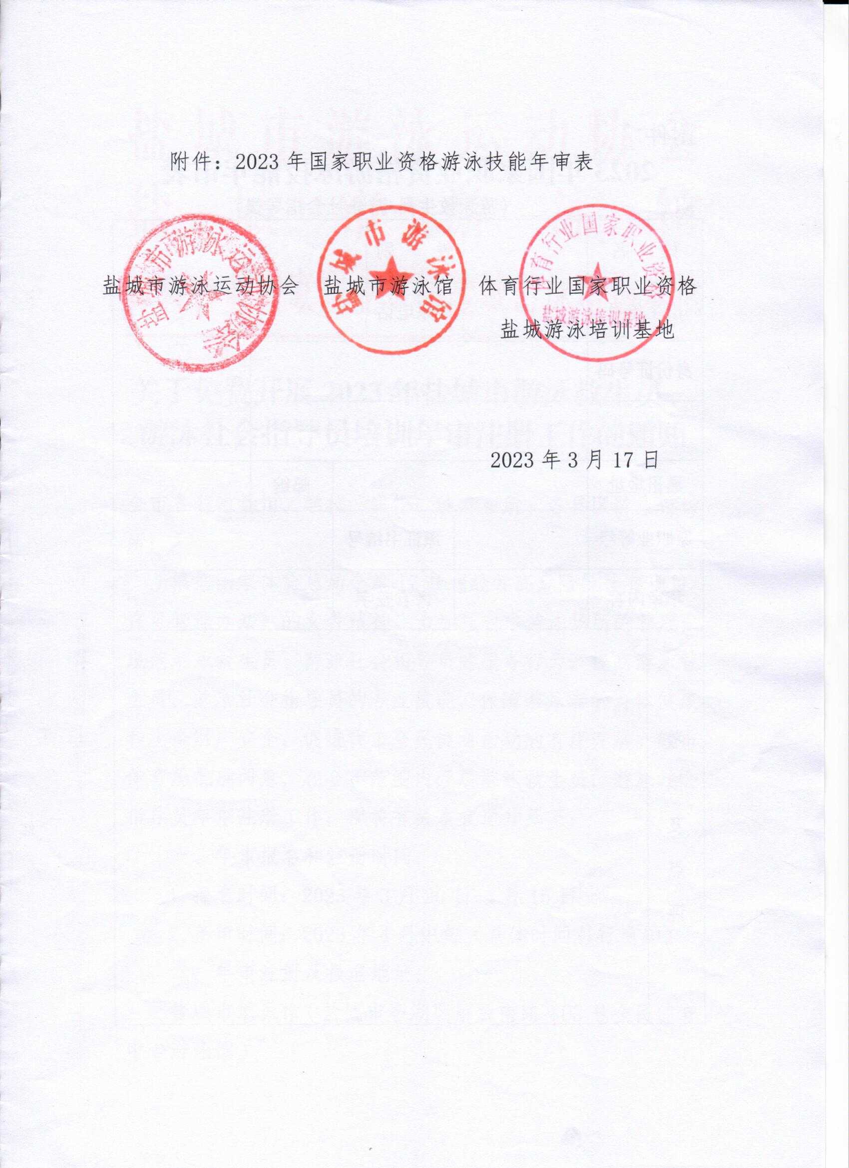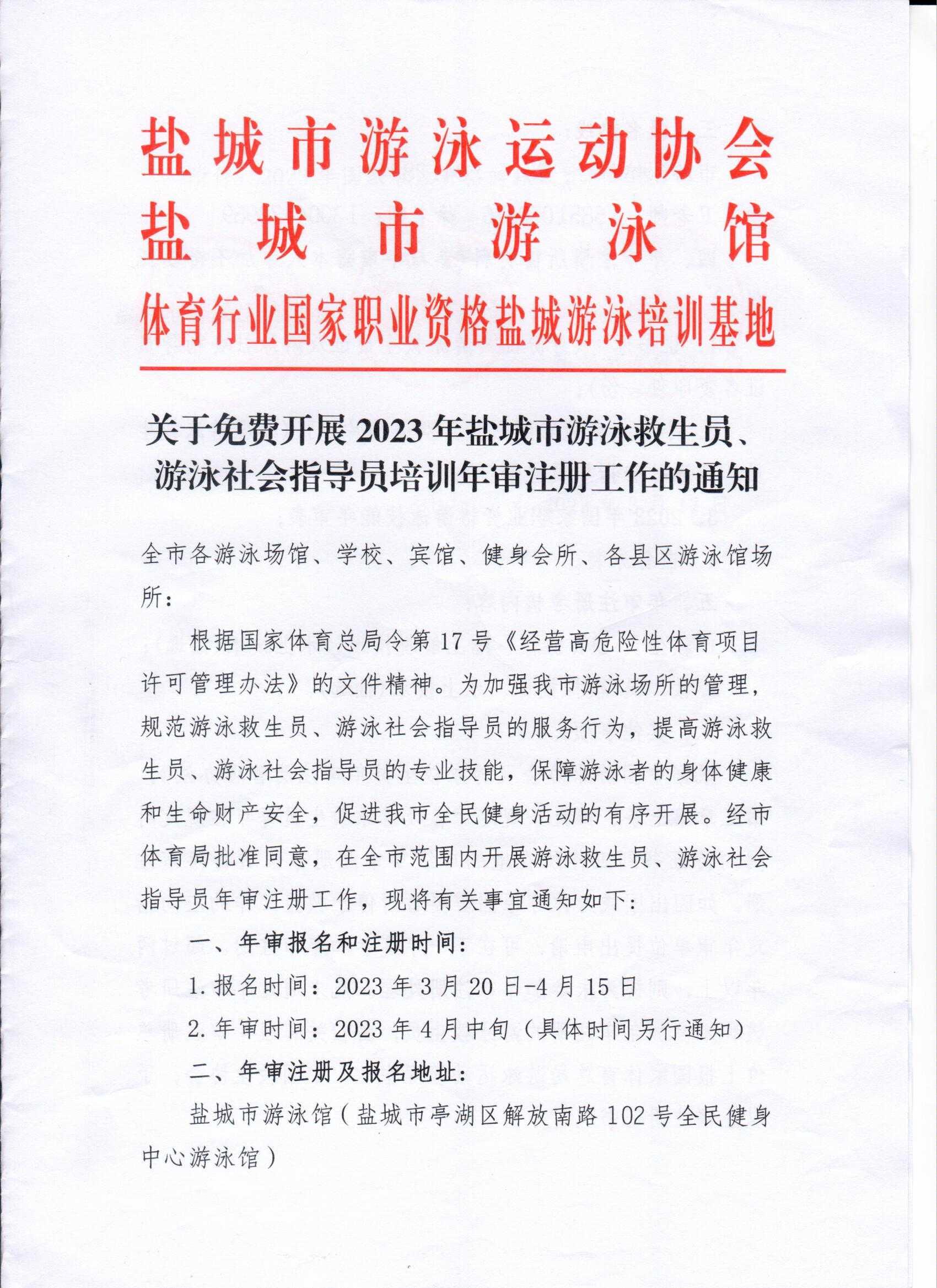 关于免费开展2023年盐城市游泳救生员、游泳社会指导员培训年审注册工作的通知