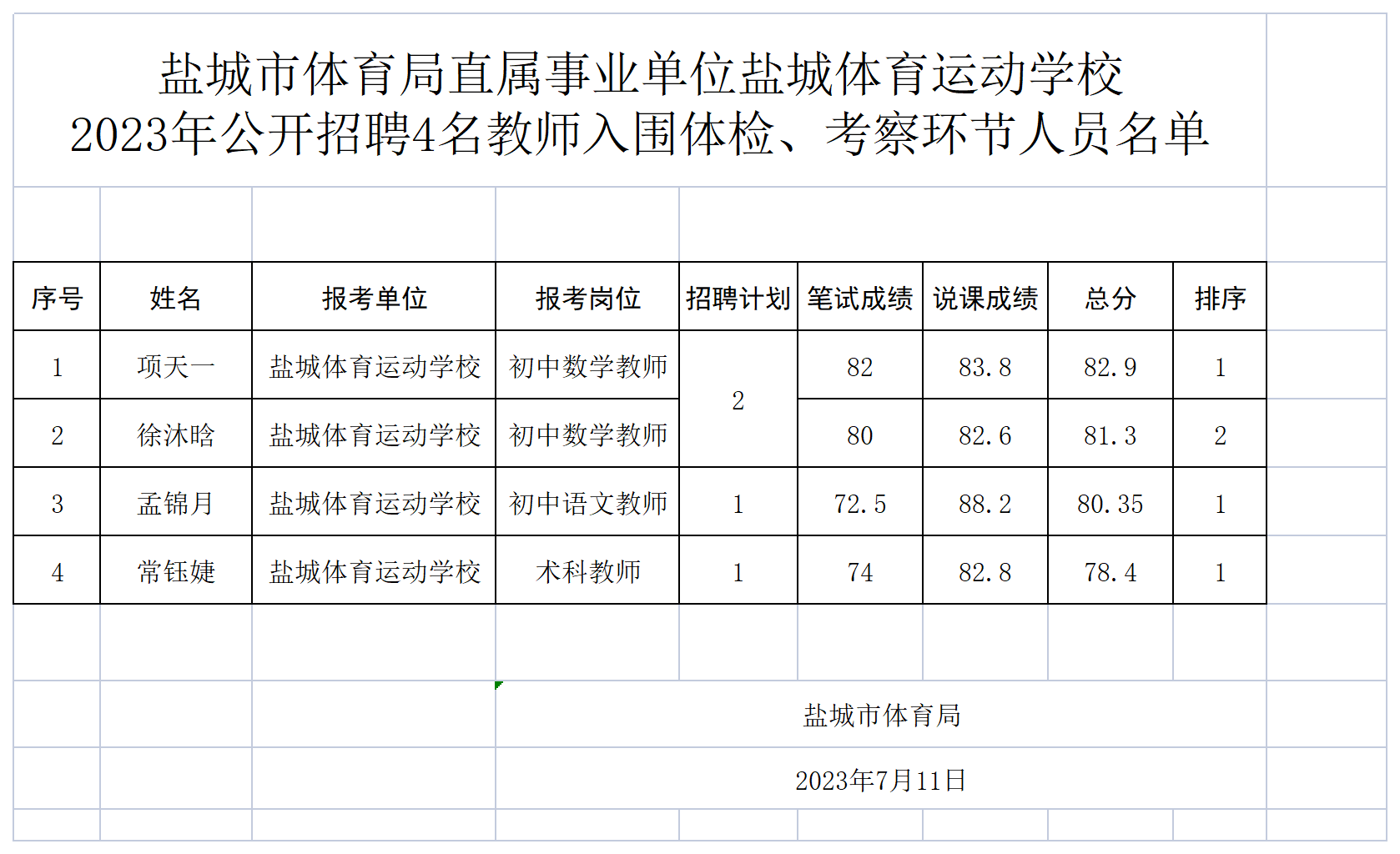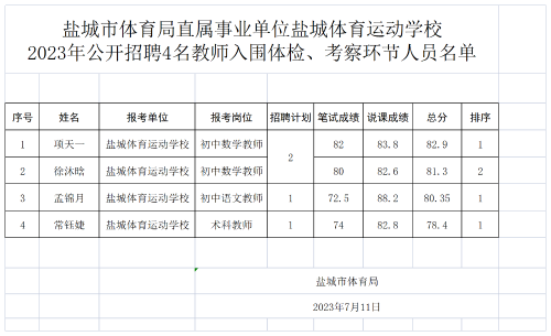 盐城市体育局直属事业单位盐城体育运动学校2023年公开招聘4名教师入围体检、考察环节人员名单