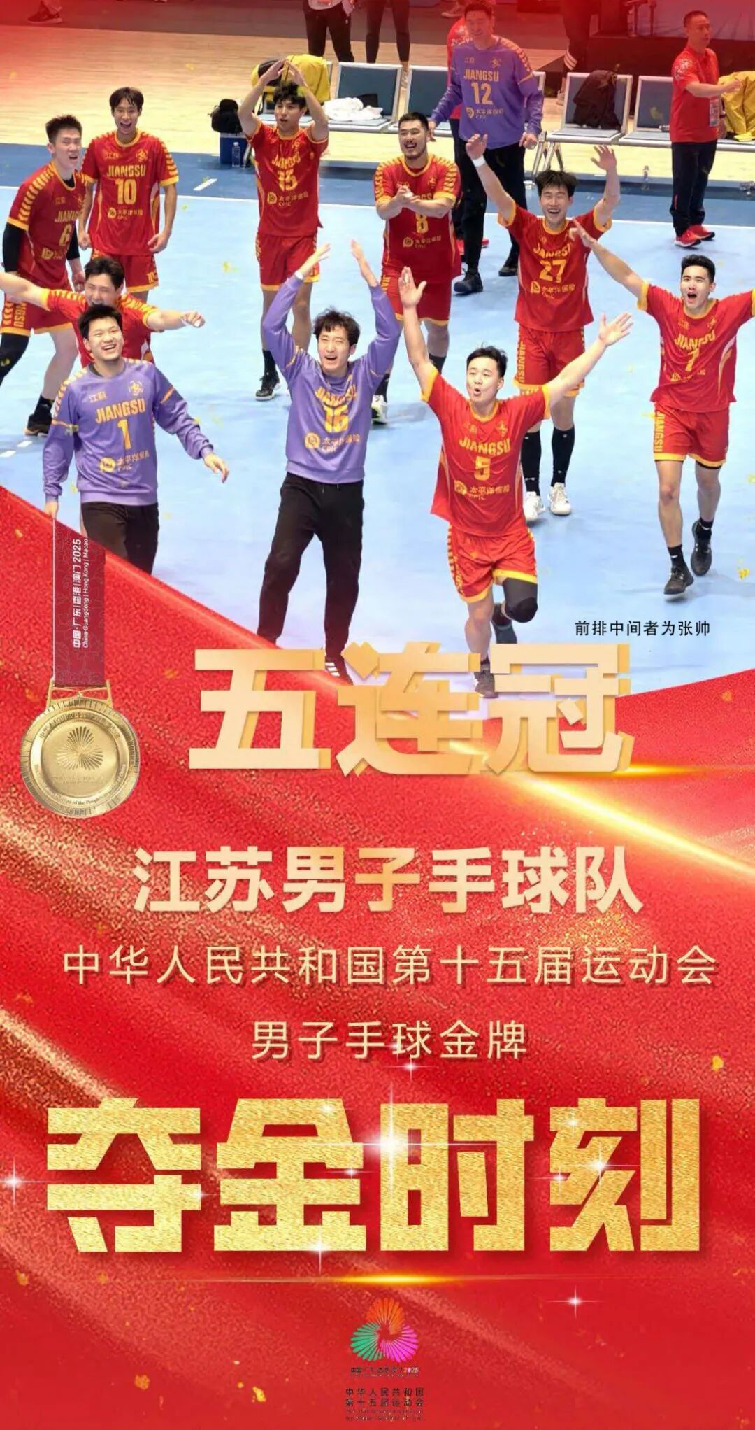张帅曾随江苏男子手球队获得第十四届全运会冠军。本届全运会,他们一路高歌猛进,与同样保持全胜的安徽队会师决赛。此役,江苏队主打边路策应和攻防转换,并取得了不错的进攻效率,以17:12领先结束半场。易边再战,安徽队加大进攻火力,一度将分差迫近至3分。终场前,江苏队稳住阵脚,以29:26守住胜局。