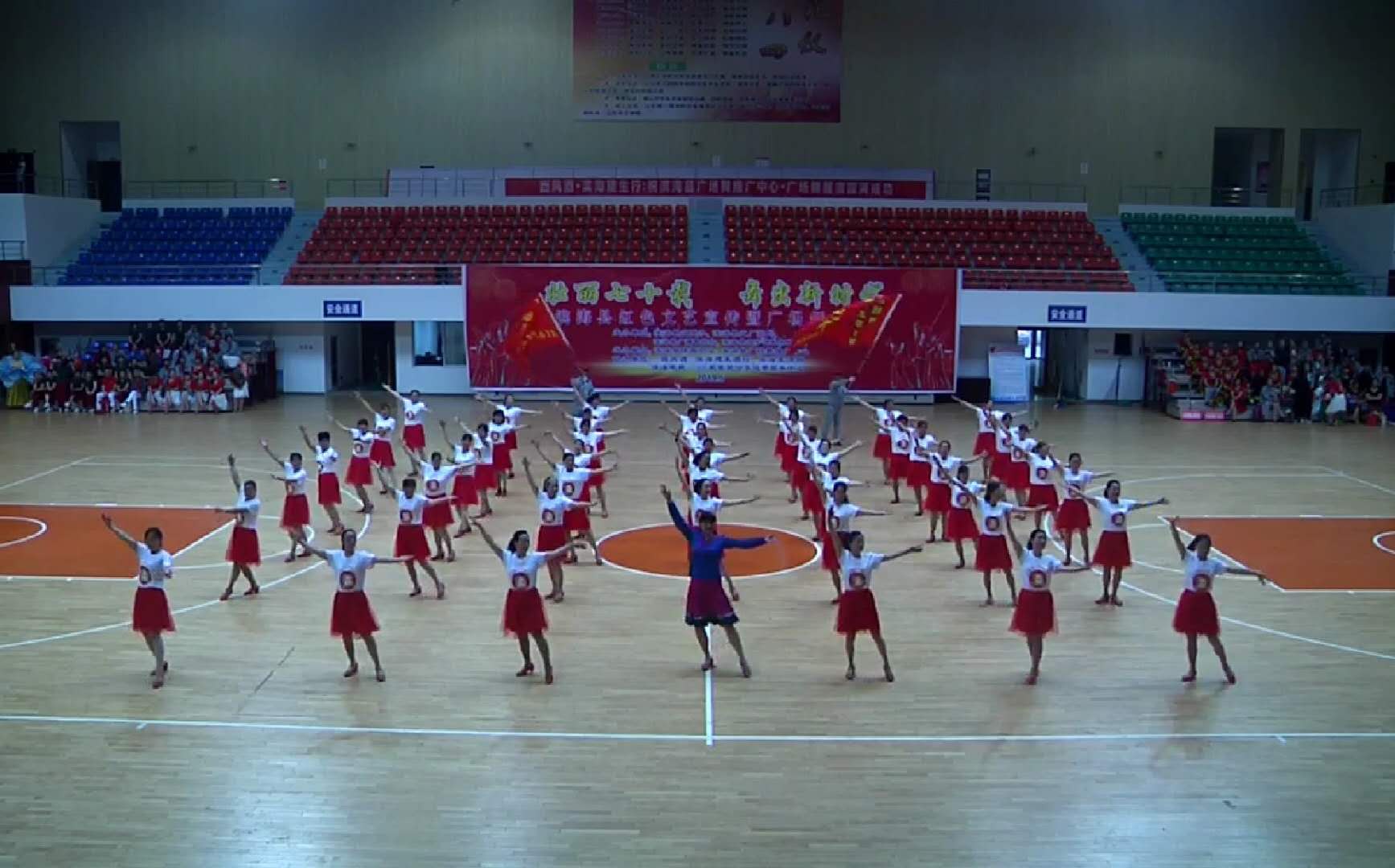 5月19日上午,千余名来自全县近60个广场舞站点的排舞爱好者在滨海县永宁实验学校和滨海县体育中心集体展示了《共筑中国梦》、《万树繁花》和《我和我的祖国》等舞蹈。