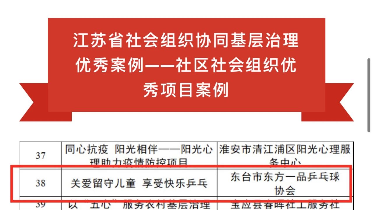 日前,江苏省民政厅公布2022年江苏省社会组织优秀案例,由东台市东方一品乒乓球协会申报的“关爱留守儿童 享受快乐乒乓”获江苏省社会组织协同基层治理优秀案例(社区社会组织优秀项目案例),盐城地区仅此一例入选。