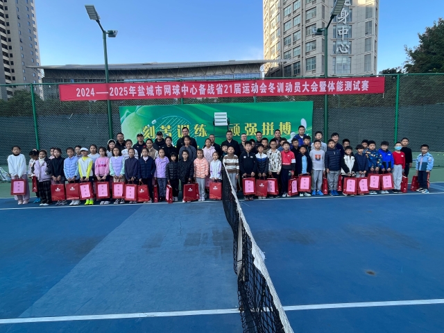 11月24日上午,2024-2025年盐城市网球中心备战省21届运动会冬训动员大会暨体能测试赛在市网球中心举行。