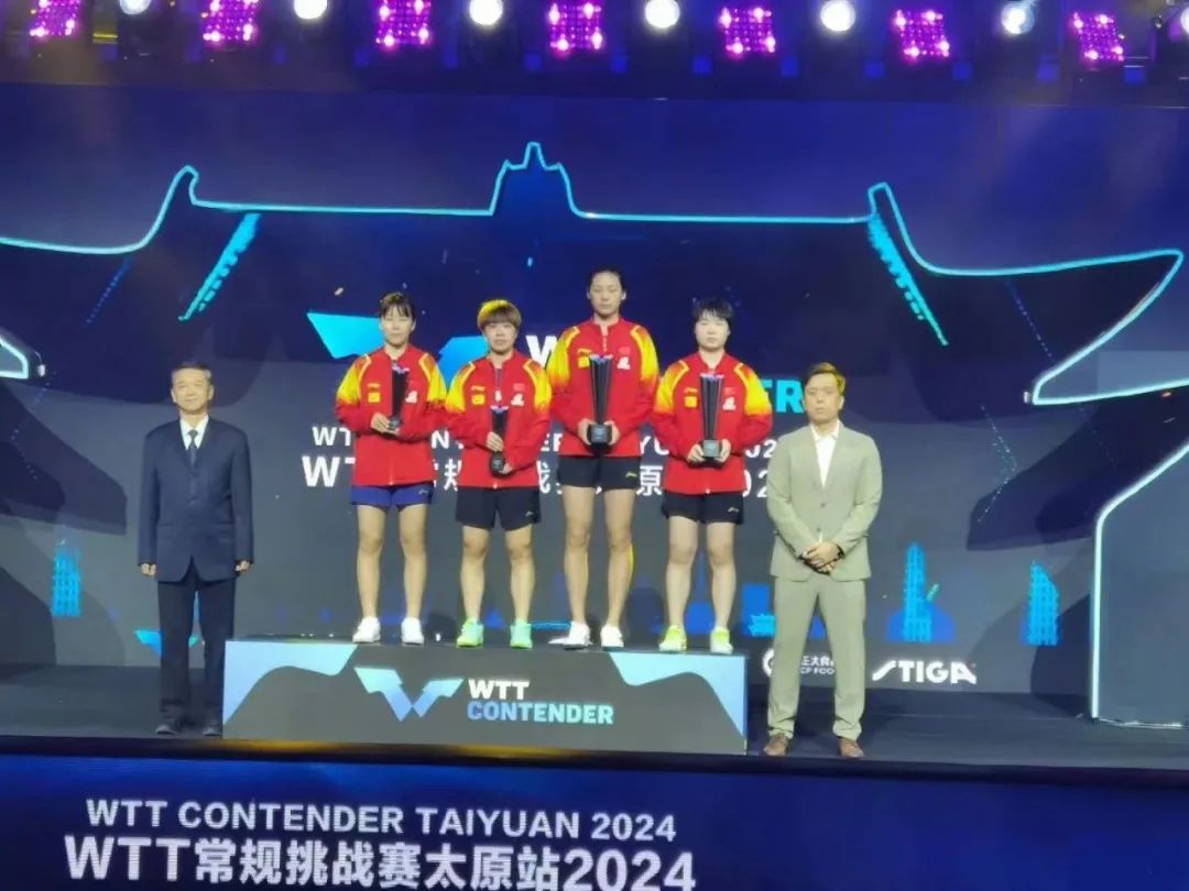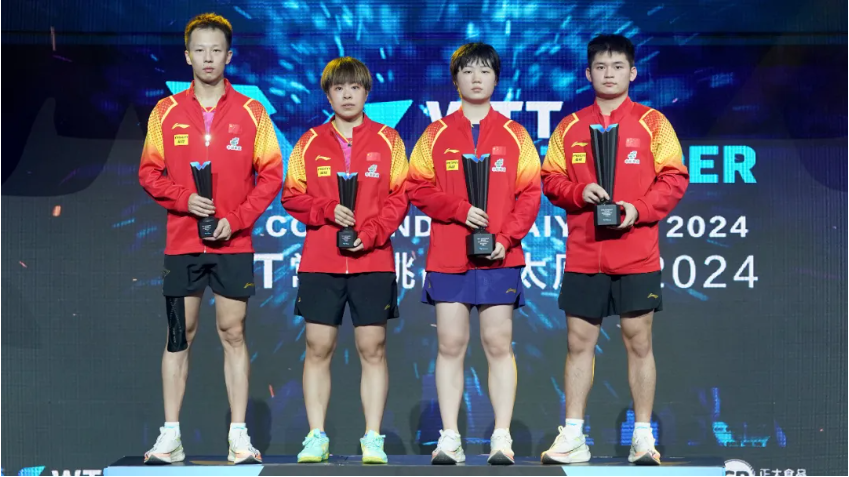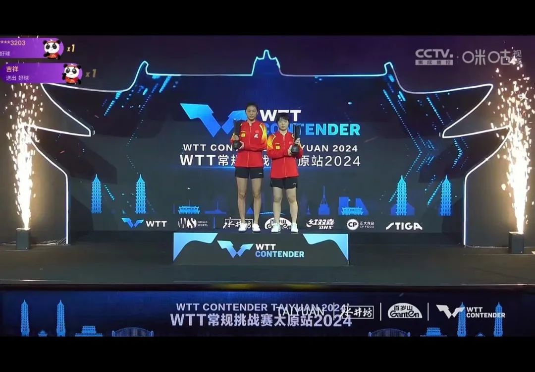 第四局比赛临近尾声时,蒯曼/陈熠组合在10比5领先的情况下,被对手连追2分,关键时刻两位小将赶紧叫了暂停,稍作调整后,蒯曼/陈熠组合顺利以11比7锁定决胜局,成功赢得女双冠军,同时也成就了蒯曼的双冠王。
