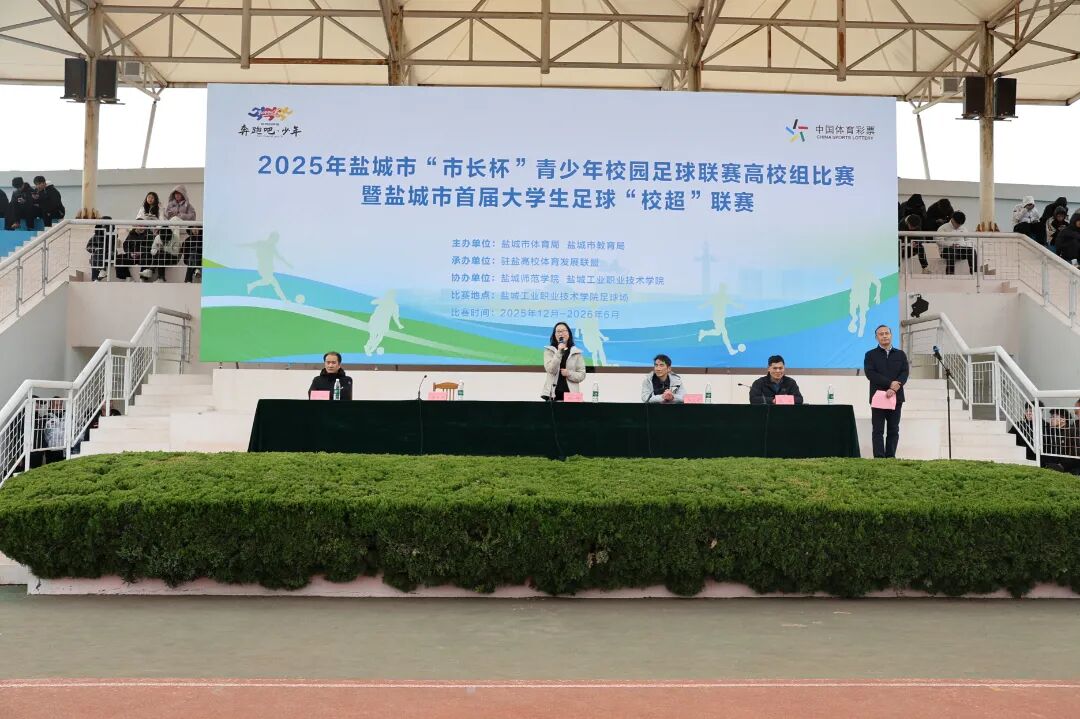 12月12日下午,2025年盐城市“市长杯”青少年校园足球联赛(高校组)暨盐城市首届大学生足球“校超”联赛开幕式在盐城工业职业技术学院体育场举行,市体育局局长徐丹宣布开赛并为揭幕战比赛开球,盐城工业职业技术学院副校长陈宏武、盐城师范学院体育学院院长张兵、盐城工业职业技术学院体育学院院长施兴成等出席,市体育局党委委员、四级调研员李文进主持开赛仪式。