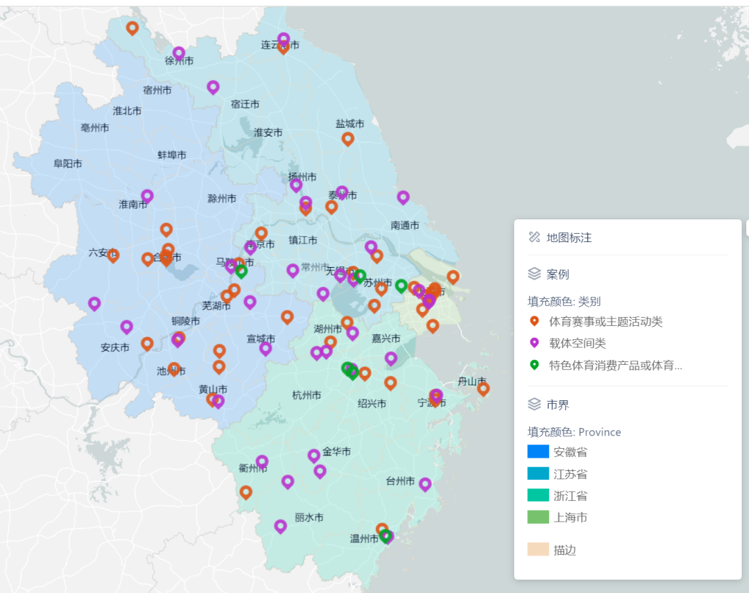 本次发布采用线上地图模式,借助前沿数字技术,将长三角地区的各类体育案例成果精准标注在电子地图上,构建起直观立体的可视化展示系统。同时,线上地图将在 “长三角体育产业信息平台”和“长三角体育一体化研究” 公众号上开设 “长三角地区体育消费场景案例地图” 专题专栏。通过缩放数字地图,获取对应项目的图文介绍与地理区域,从空间维度将分散的案例成果进行整合串联,以宏观视角对长三角地区体育成果进行系统性、全局性了解。