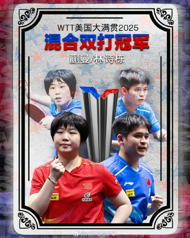 北京时间7月12日2025年WTT美国大满贯混双决赛中中国组合林诗栋/蒯曼3-0战胜韩国组合林仲勋/申裕斌栋曼组合夺得冠军
