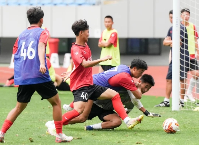 7月15日傍晚,位列“苏超”积分排行榜第二名的盐城队,迎来媒体开放日。在奥体中心体育场,盐城队为迎战劲旅南通队正在紧张集训,防守方与进攻方对抗十分激烈。不少市民自发前来,为队员们加油助威。作为“苏超”13支球队中最年轻的球队之一,盐城队主力队员平均年龄为20岁。其中,18名“学生娃”为球队注入青春活力,门将严子航尤为亮眼,他和队员葛宇翔轮番登场,不断上演精彩扑救,彰显盐城足球风采。