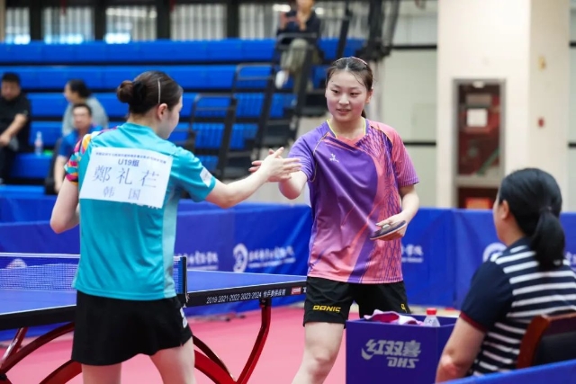 盐城小将姚丹在与韩国选手鄭礼芢的对战中,开局一度落后3分,但她沉着应对,凭借灵活的移动和多变的发球技巧,逐渐将比分追平。中场等待时,鄭礼芢主动走上前,用不太流利的中文说着“很棒”,姚丹腼腆地点头回应,两人随即相视而笑,成为赛场上一幕温馨的画面。