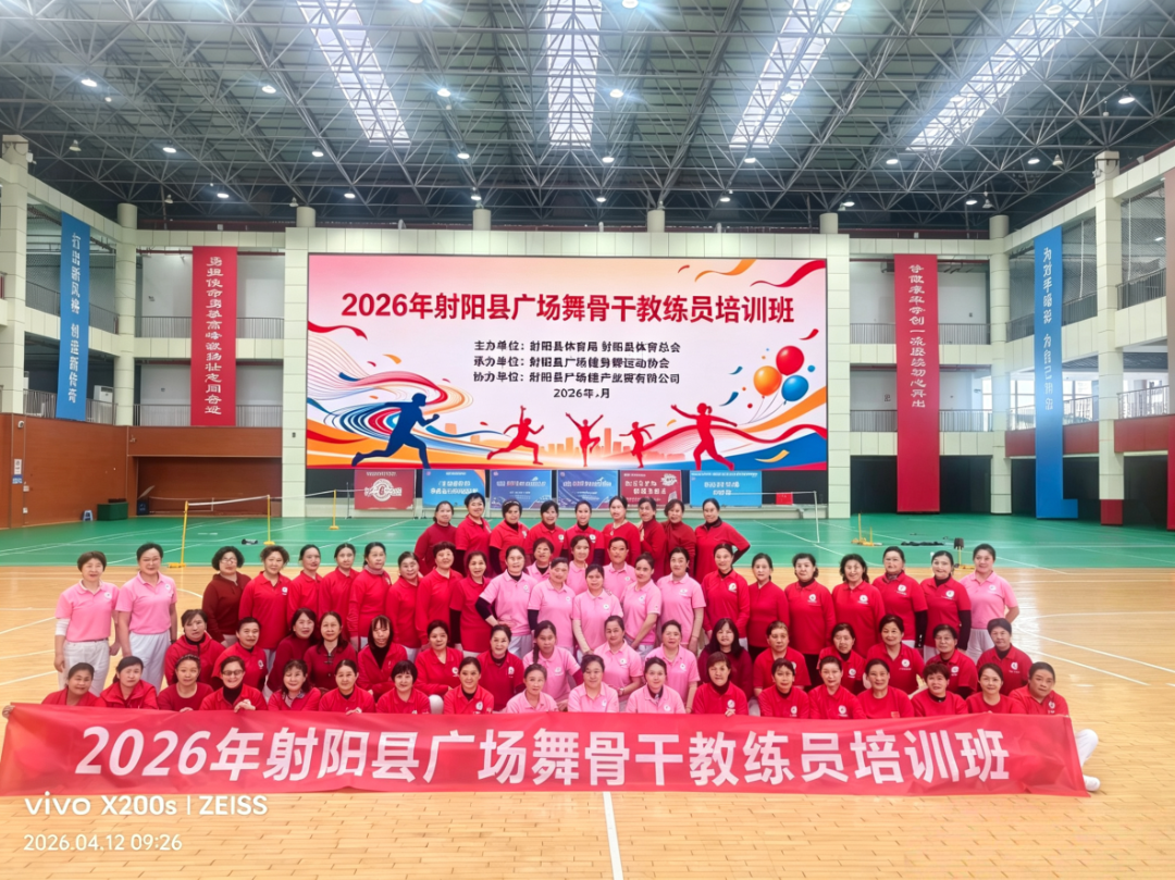 4月11日-12日,由射阳县体育局、射阳县体育总会主办,射阳县广场舞协会承办的2026年全县广场舞骨干教练员培训班在全民健身中心综合馆举行。来自全县城乡280余名站点负责人、健身骨干、教练员参加培训。